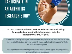 Are you an adult in Aotearoa New Zealand who has been diagnosed with inflammatory arthritis, osteoarthritis, or gout? If you are currently employed, or have been employed in the past two years, you may be eligible to take part in a research study exploring work and arthritis.