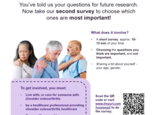 The SOAR (Shoulder Osteoarthritis Research Priority Setting Partnership) team have made their second survey available so people with shoulder OA, their carers and healthcare professionals can choose their top 10 most important questions they think are important to help set future research priorities.