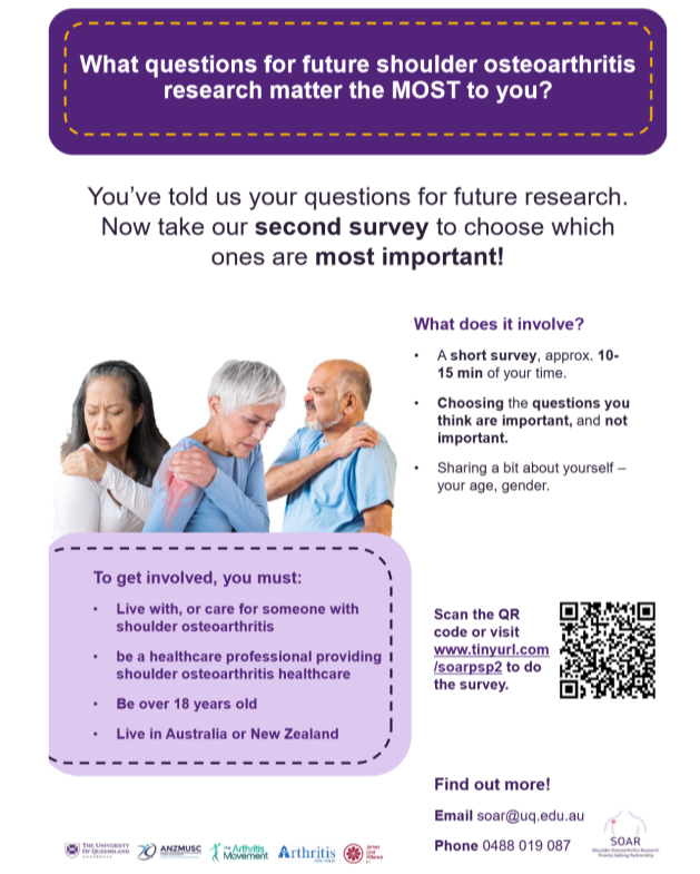 Do you live with shoulder osteoarthritis, care for someone with it or treat it? New Zealand participants over 18 years of age are invited to complete a short Trans-Tasman survey to share what you think is important to research about shoulder OA.