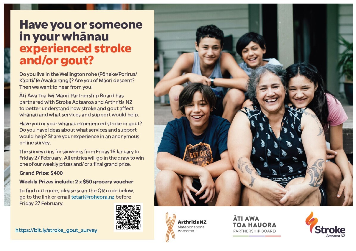Ātiawa Toa Hauora Partnership Board has partnered with Stroke Aotearoa and Arthritis NZ to better understand how stroke and gout affect whānau and what services and support would help.